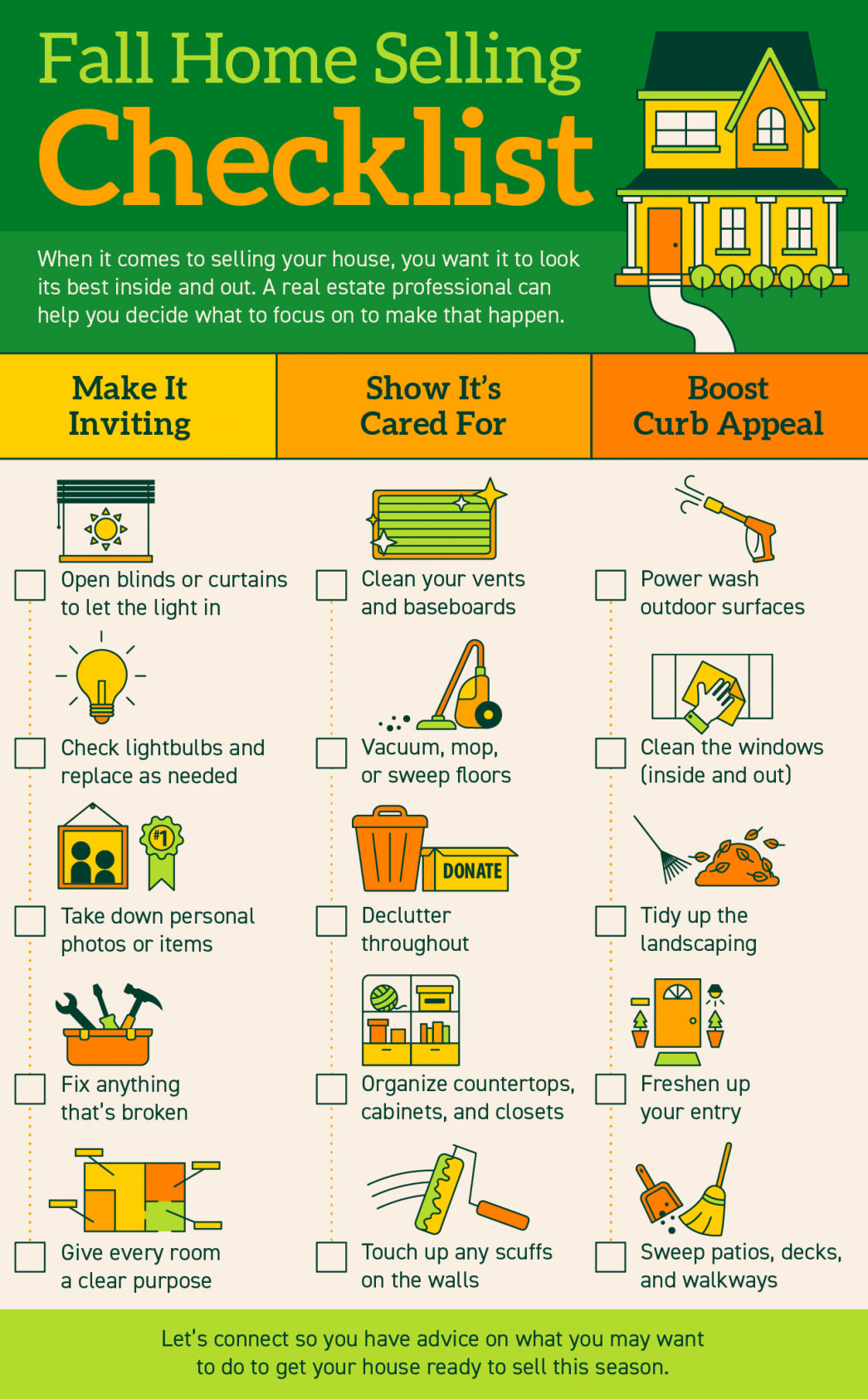 When it comes to selling your house, you want it to look its best inside and out so it catches the attention of buyers. A real estate professional can help you decide what to do to make that happen. Focus on tasks that can make it inviting, show it’s cared for, and boost your curb appeal. Let’s connect so you have advice on what you may want to do to get your house ready to sell this season.