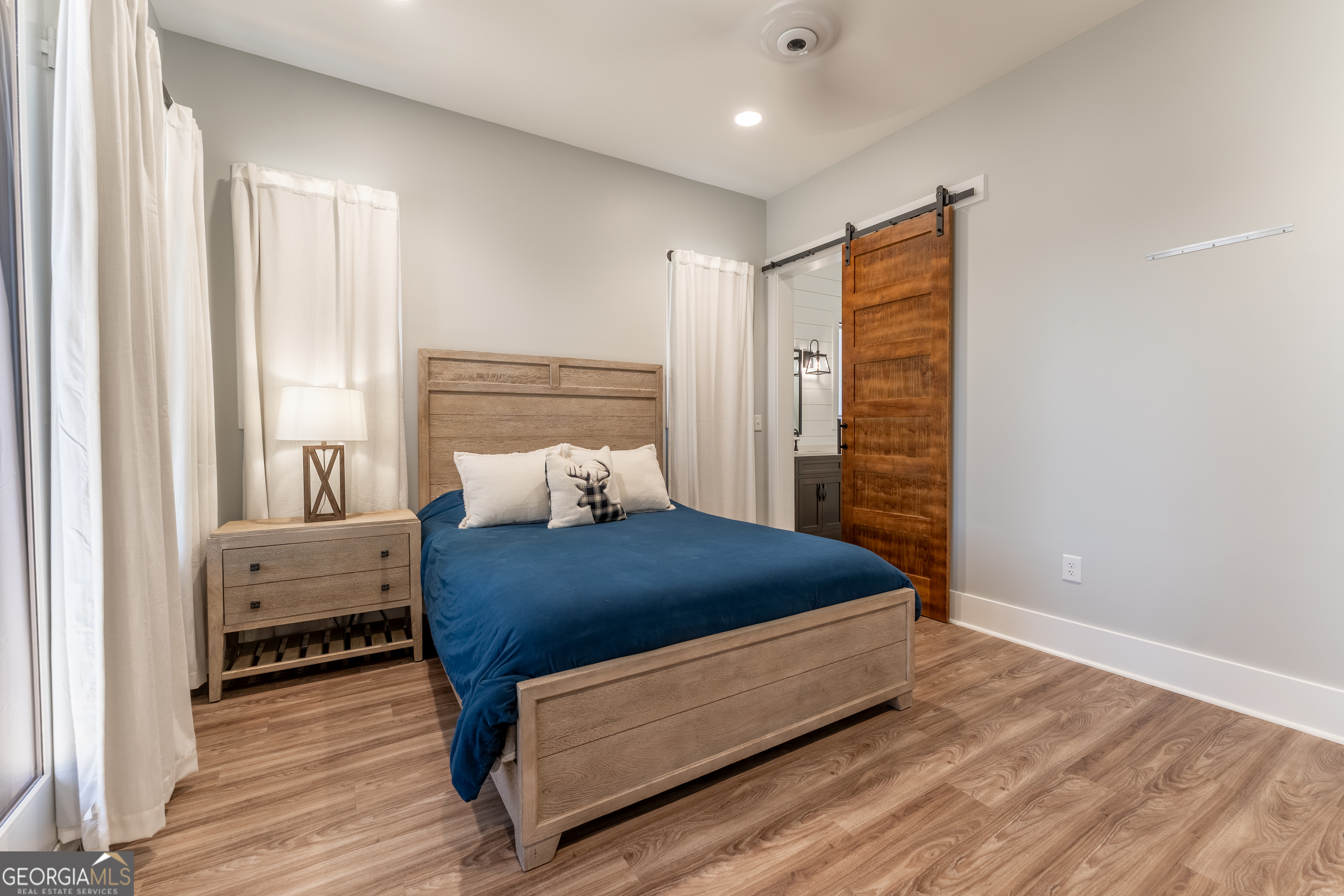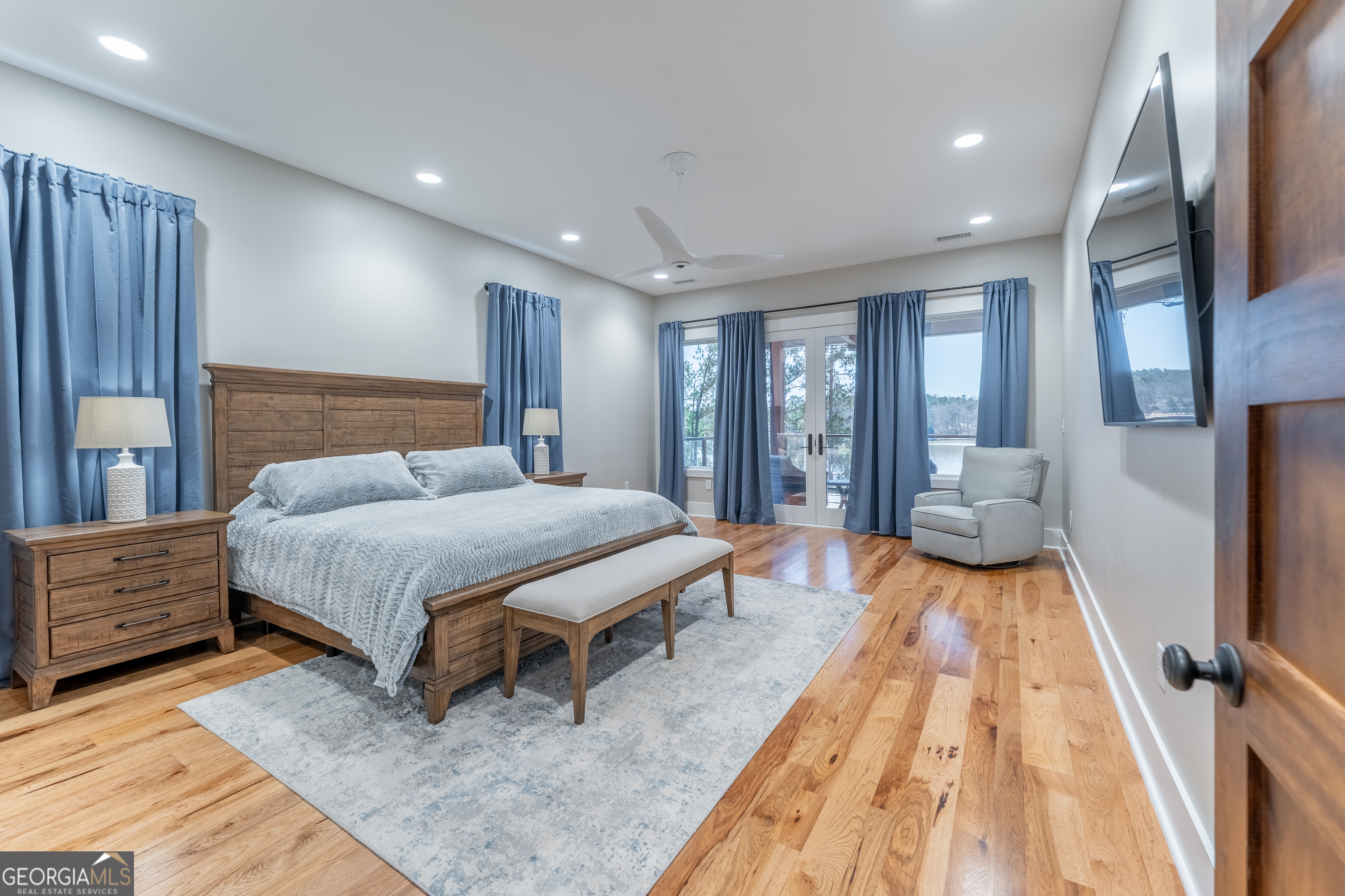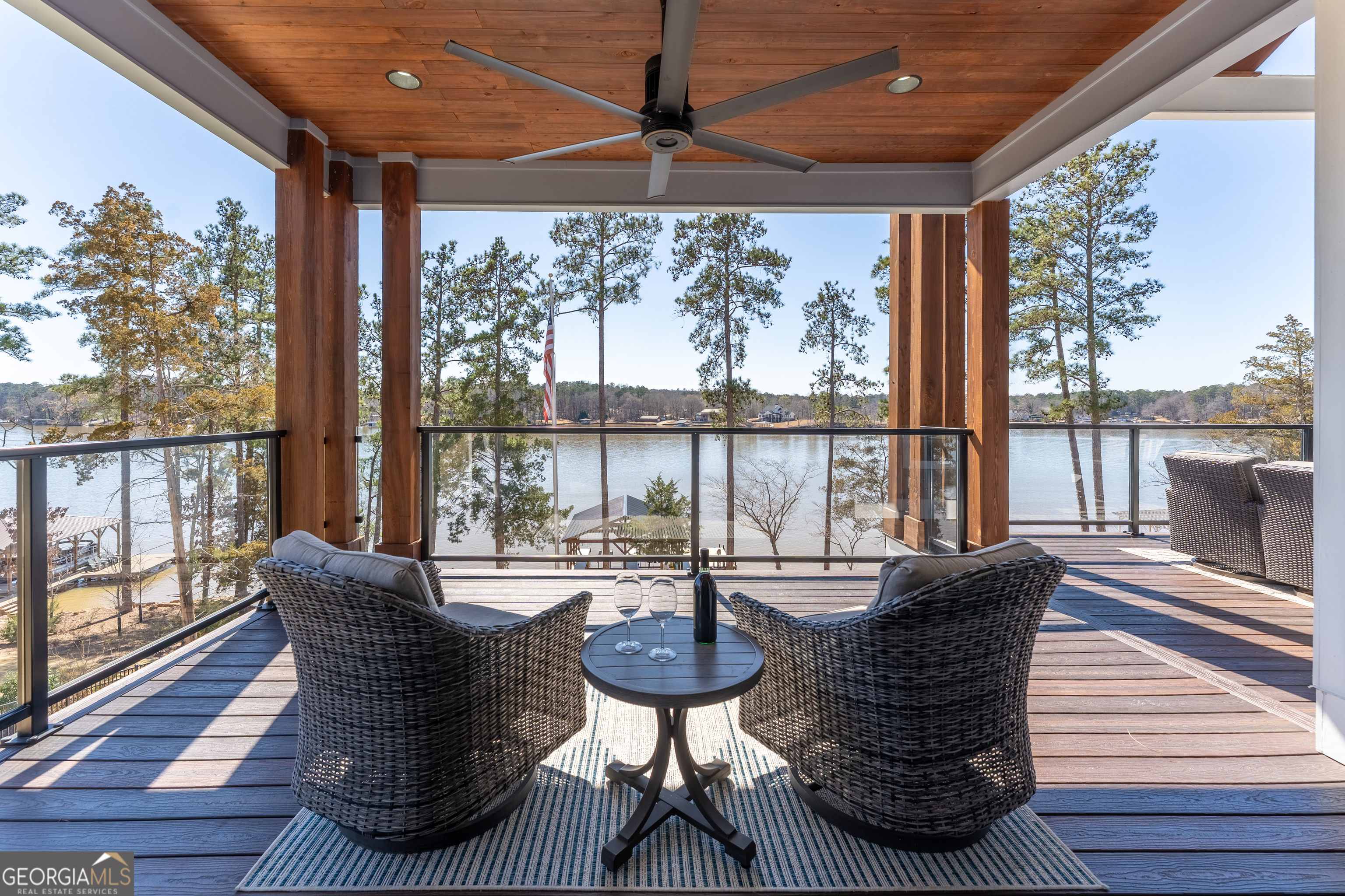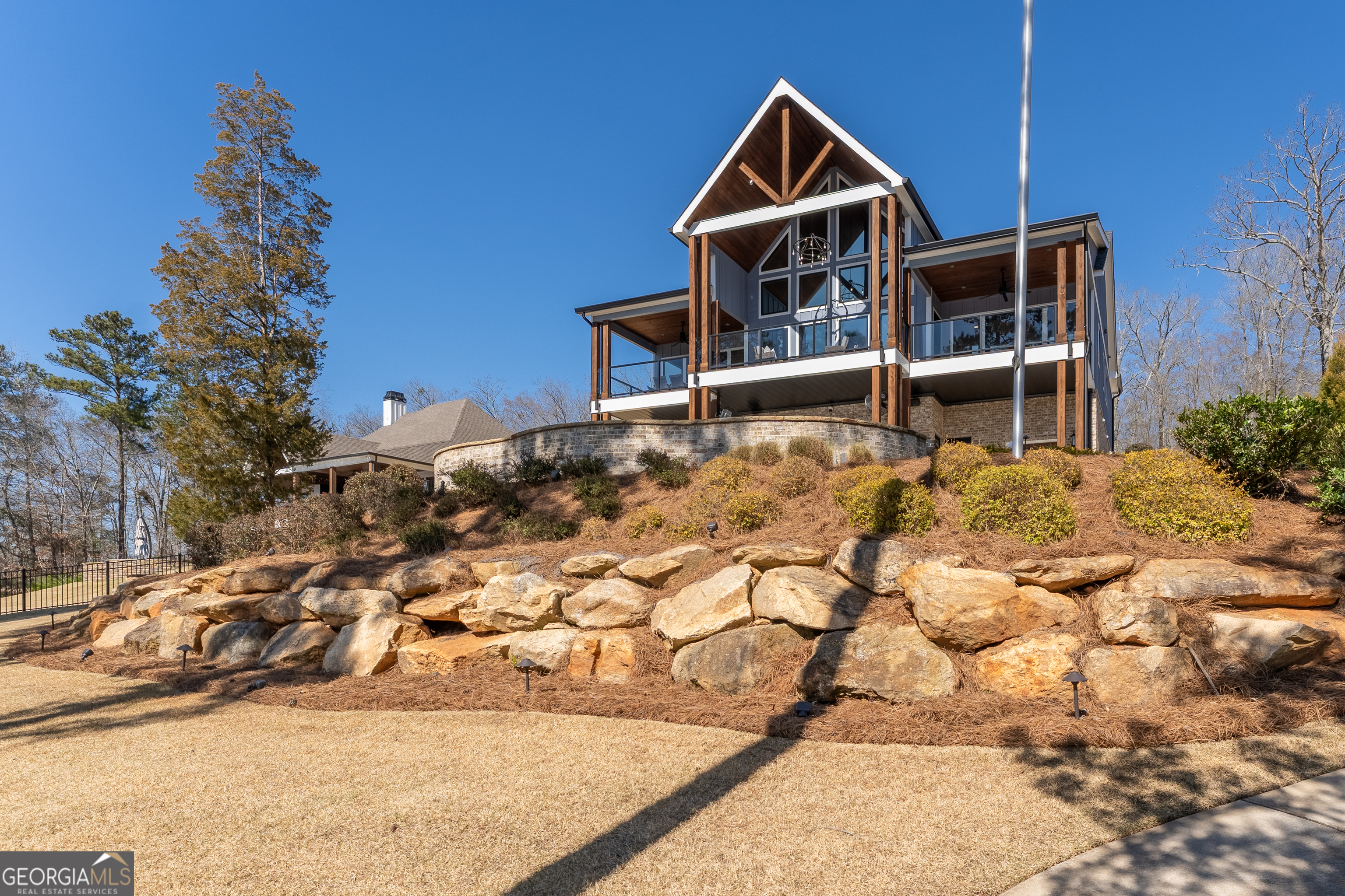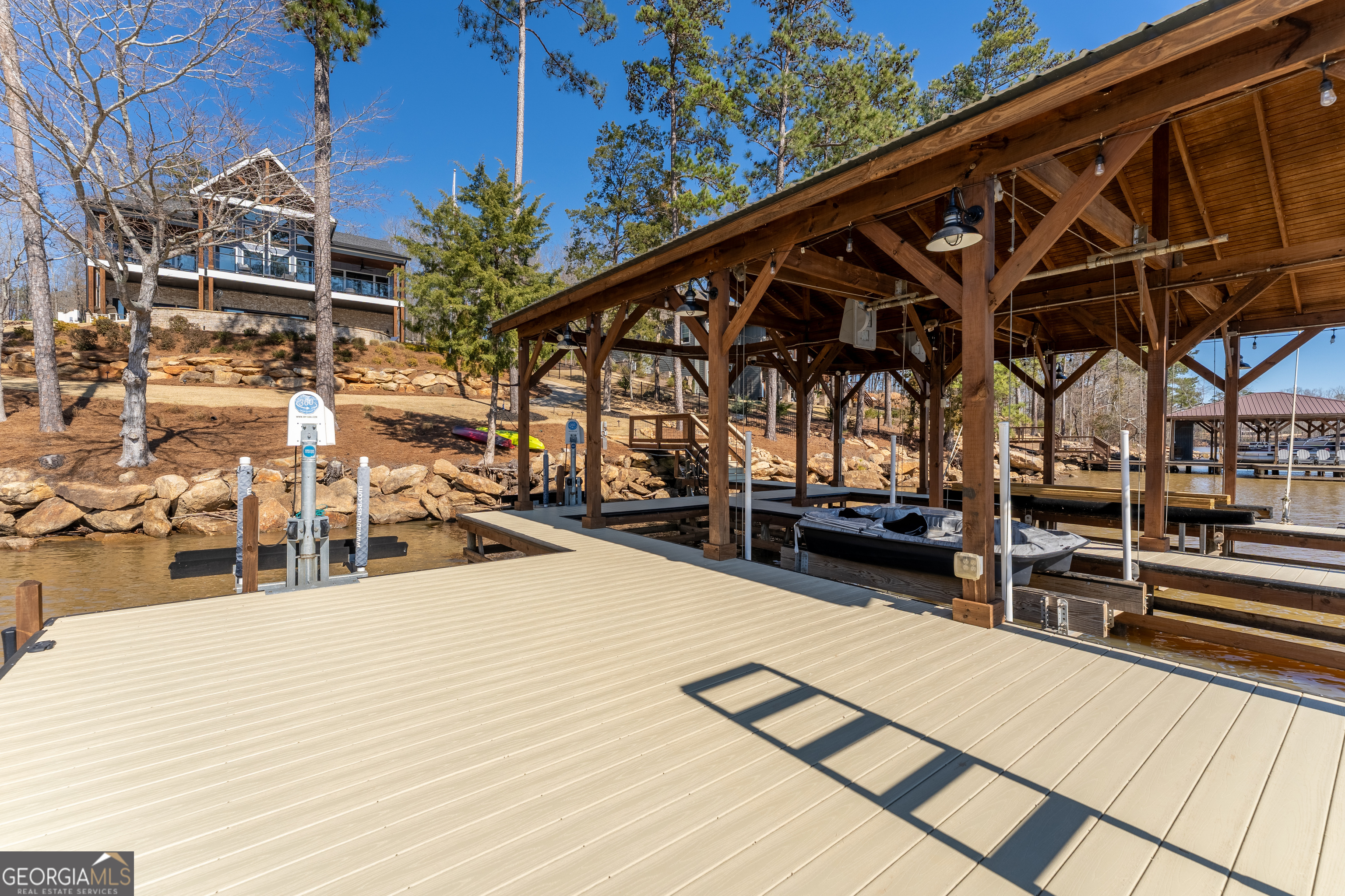 **Luxurious Lakefront Living at Its Finest** Discover the pinnacle of lakeside luxury with this custom-built home in an exclusive gated community, offering breathtaking big water views and 125 feet of pristine shoreline. Crafted with impeccable attention to detail, the open floor plan features 24-foot vaulted spruce plank ceilings and hickory hardwood flooring. The gourmet kitchen boasts quartz countertops, recessed cabinet fronts, a gas stove, and a large walk-in pantry. The main floor includes a spacious owner's suite with serene lake views, deck access, a freestanding tub, and another bedroom and full bath. The lower level is designed for entertaining, complete with a full kitchen, open living and dining areas, 12-foot spruce plank ceilings, a guest suite with a full bath. The workshop/garage area offers the opportunity to add a 4th bedroom-ideal for guests, a home office, or extended family. This space provides convenient access directly to the covered porch, featuring a cypress plank vaulted ceiling and interlocking composite decking, as well as to the covered patio on the terrace level. The outdoor space is a true retreat, featuring a saltwater pool, professionally landscaped 1.01-acre grounds with lighting, a sprinkler system, and a metal fence. The covered boathouse dock includes two slips with lifts (one for a pontoon and one for a wakeboard boat), two personal watercraft lifts, and a sun platform. The home also includes a safe room, wireless access points throughout, and an EV charging station. Additional features include a whole-house 50kW Commercial Kohler generator, two 50-gallon water heaters, 2x6 exterior wall framing, spray foam insulation in walls and ceilings, Marvin black fiberglass windows, black aluminum exterior doors, 8-foot real wood stained interior doors, and commercial lighting and fans throughout. The gated community offers additional amenities, including a community pool, boat slips, and boat trailer parking. This property is the perfect blend of elegance, functionality, and lakeside tranquility. Don't miss your chance to make it yours!